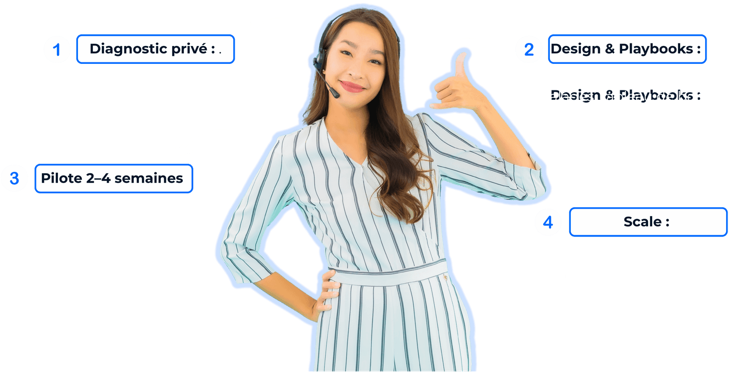 Ainsi, vos clients bénéficient d’une expérience fluide, professionnelle et 100 % cohérente avec votre identité de marque. comme s’ils échangeaient directement avec votre propre équipe interne.
